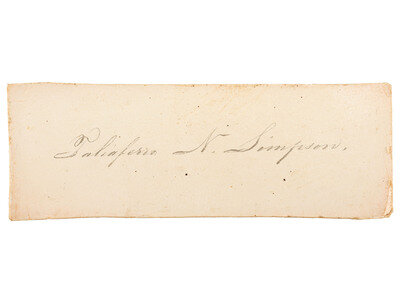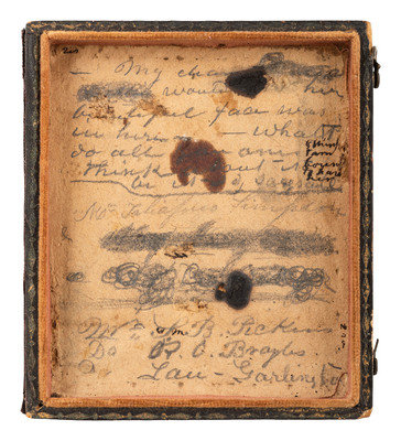 A small name card, approx. 1 3/4 x 5/8 in., was also discovered inside the case, which is signed ("Taliaferro N. Simpson"). Simpson's middle name was originally Calhoun, but research indicates that he later dropped the “Calhoun” and adopted the practice of including “N.” as his middle initial, apparently meant to signify “no middle name." (Information obtained from Clemson University website, 2 November 2023.)