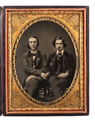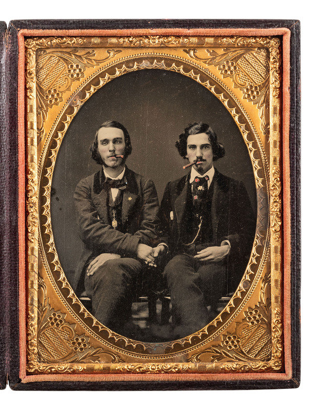 Seated portrait of a pair of finely dressed gentlemen with long hair, holding hands and smoking cigars. (Some surface scratches and rubs, other imperfections, some areas with little definition where uneven/worn away lacquer can be seen through the image; unsealed.) Housed in a pressed paper case. The fellows each wear a gold-highlighted 6-point star, possibly of fraternal significance. Red tinting appears throughout the image, at the end of each cigar, on the men's lips, and on portions of the tie worn by the gentleman on the viewer's right. Each man wears a jacket with wide velveted lapels and a gold-highlighted watch chain. The gentleman on the viewer's left also sports a gold-highlighted pinkie ring on the hand with which he clasps his mate's hand.