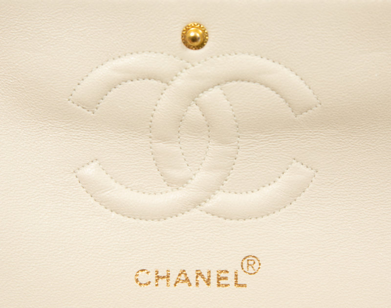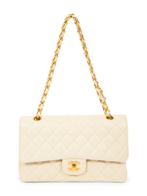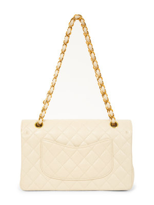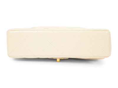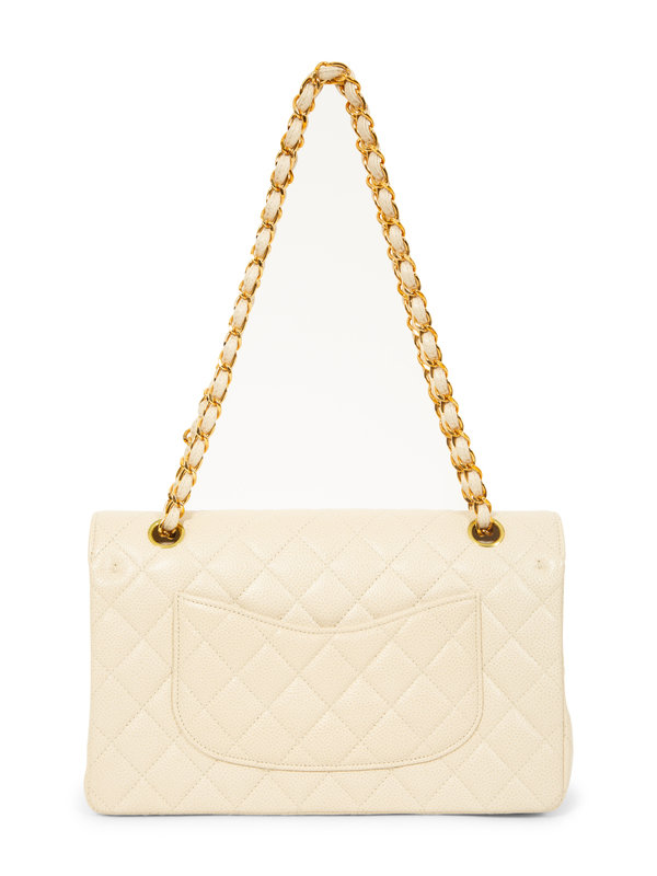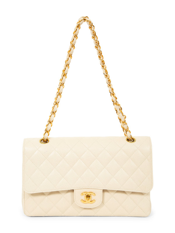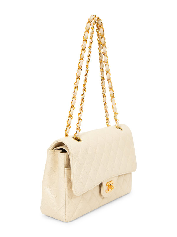 Medium, double-flap shoulder bag in quilted, vanilla caviar leather with gold-tone metal hardware. Bag features a turn-lock closure at flap, a gold-tone metal chain interwoven with leather, and tonal lambskin leather lining.
