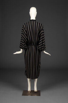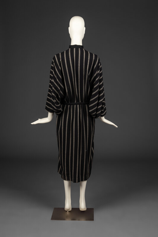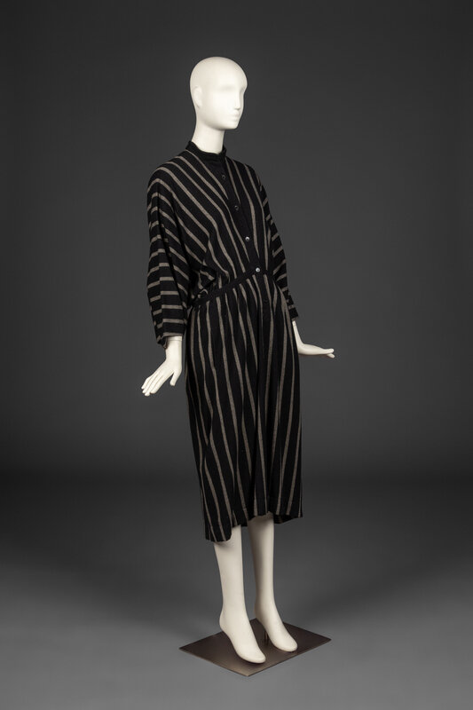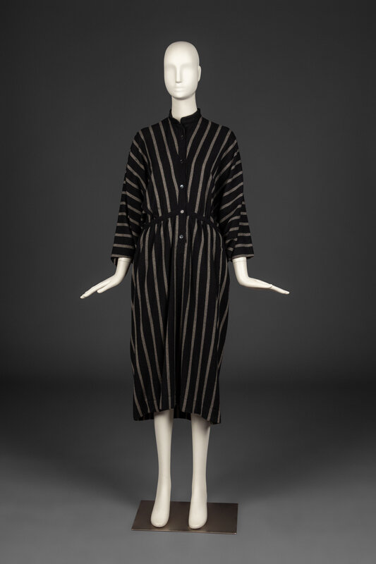 Long sleeve, dolman-sleeve dress in vertical stripe wool/alpaca blend with button-front closure. Unlined. Slash pockets at hips.
