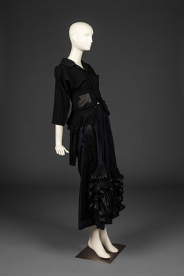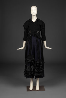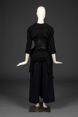Black blazer with wool upper and sheer synthetic panels. Ruffle accents with unfinished edges. Dolman sleeve. Includes spare button and fabric swatches. Autumn/Winter 2005.