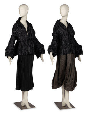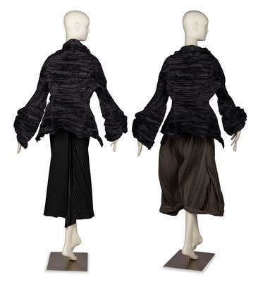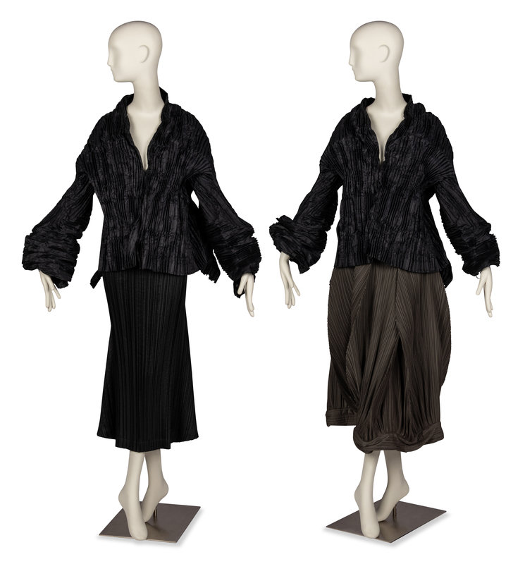 The inimitable, sculptural creations of Issey Miyake (1938-2022) bridge the gap between the gallery, runway, and street. Born and raised in Hiroshima, Miyake survived the atomic bombing at age 7 with a permanent limp, and soon after lost his mother to radiation poisoning. He became an advocate for nuclear disarmament in his later life. From a young age, Miyake was drawn to create and believed strongly in the interconnectedness of the arts. As far back as 1960, Miyake campaigned that clothing deserves appreciation for its design in the same way as architecture or furniture. After graduating from Tokyo’s Tama Art University in 1964 with a degree in graphic design, Miyake worked in Paris and New York under designers including Hubert de Givenchy and Geoffrey Beene. In 1971, he founded his eponymous design studio. Almost immediately, Miyake was lauded as a luminary. His work was soon everywhere from the cover of Artforum to the dancers of the Frankfurt Ballet.
