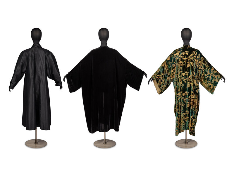 Drop-sleeve robe in green velvet with metallic gold-printed motifs and small beading embroidery throughout. Silk-lined.