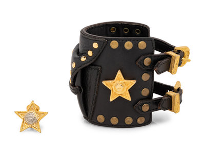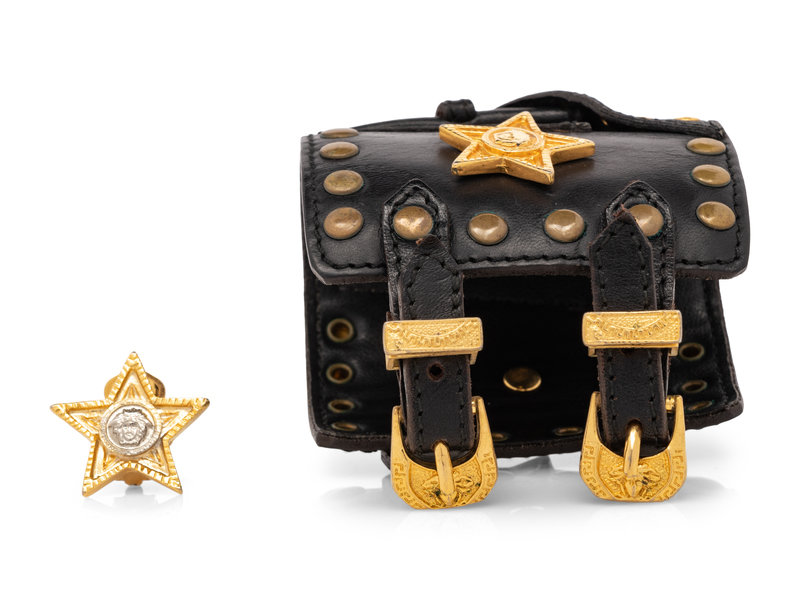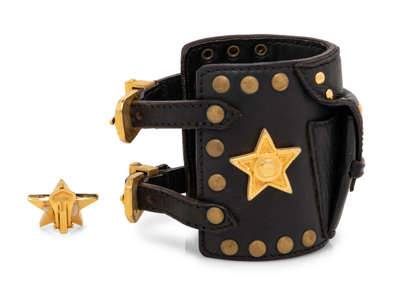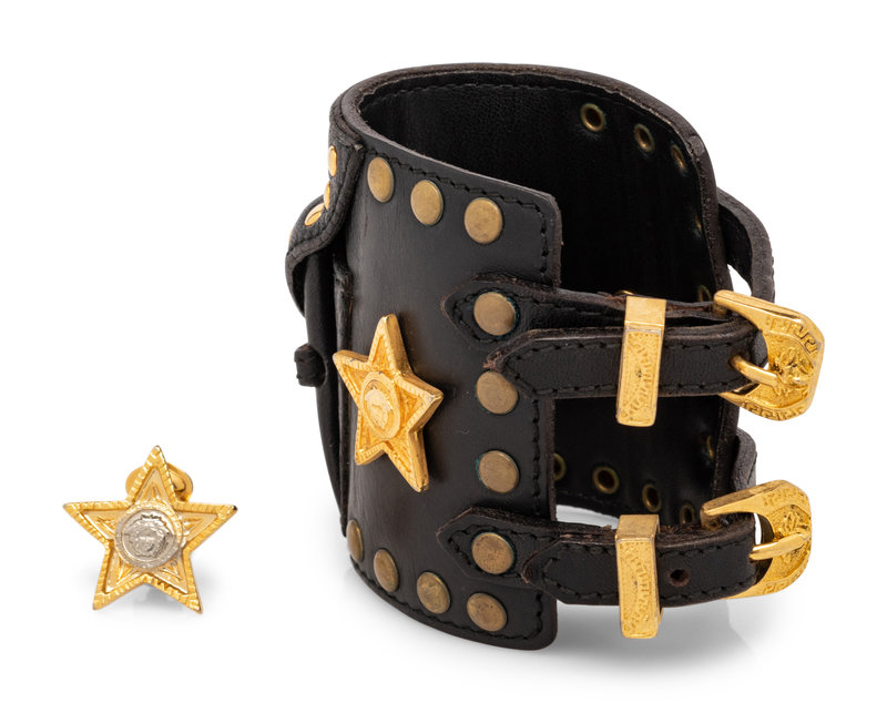 Spring/Summer 1993,comprised of a cuff with a center flap pocket, decorative grommets and goldtone stars with center embossed Medusas and dual back buckle closure; together with a matching star single earclip. Design featured in the Spring 1993 ad campaign.