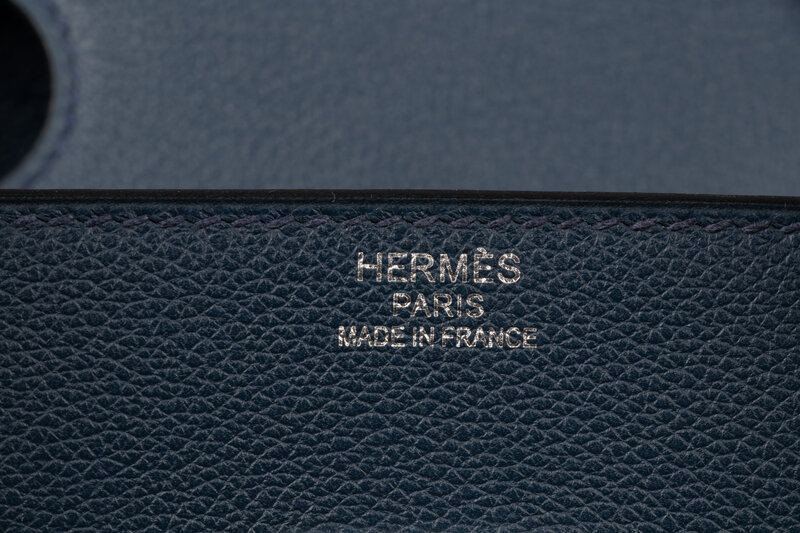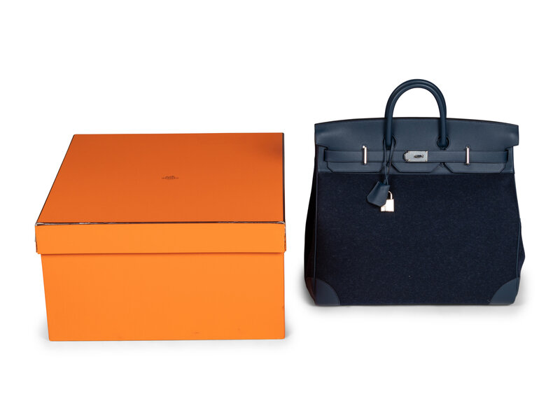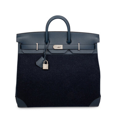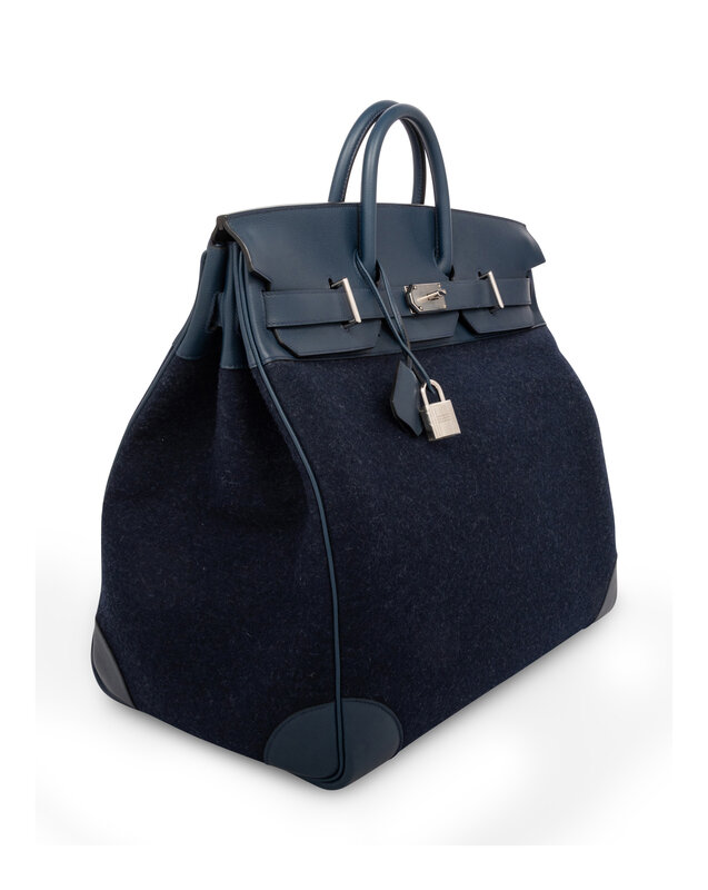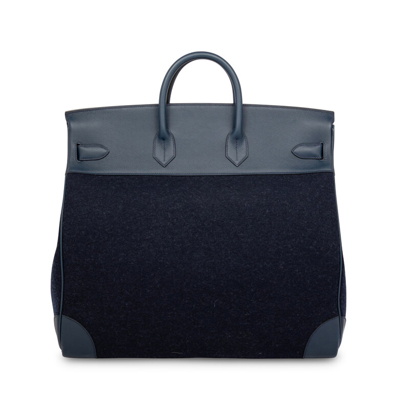 Hermès HAC Travel Birkin 50 in Bleu Nuit Evercolor Calfskin and Wool with Palladium-Plated Hardware.
