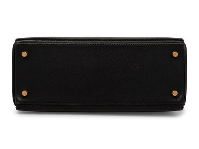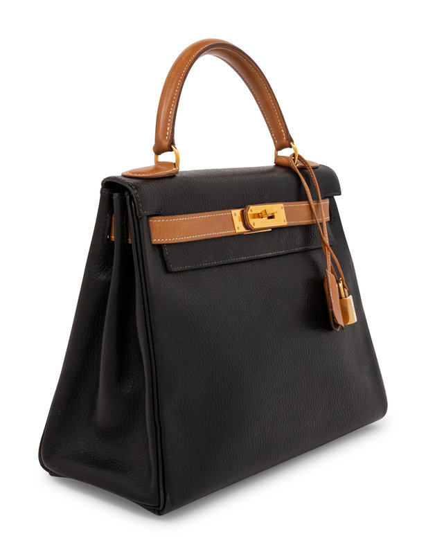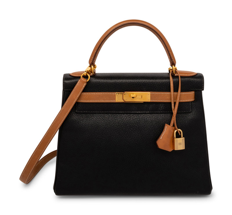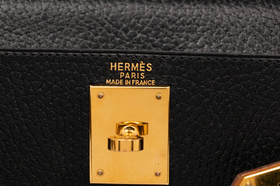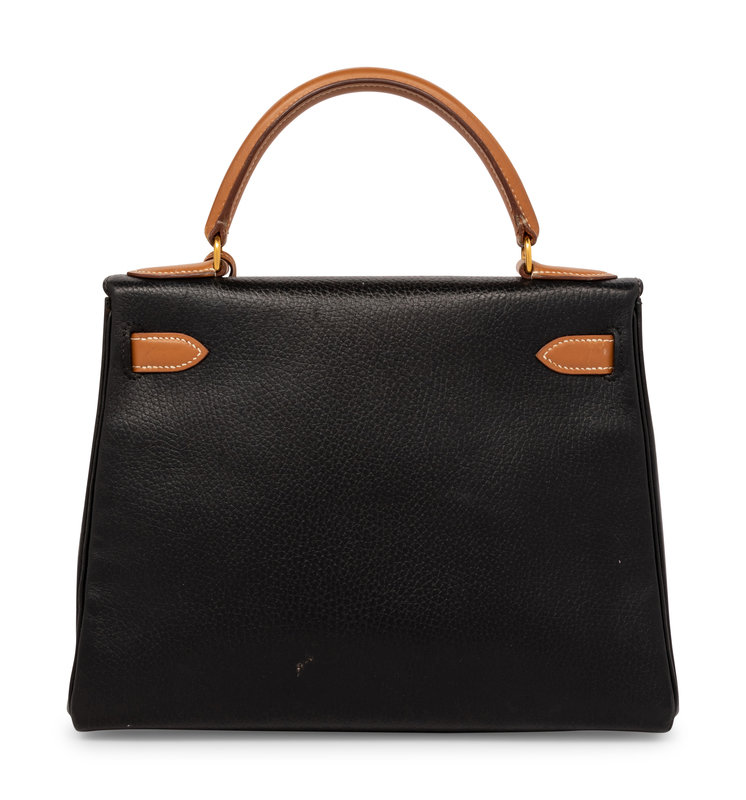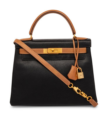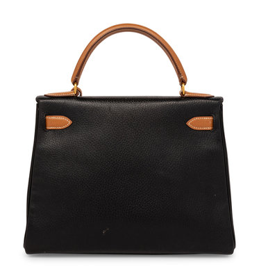 Kelly Retourne 25 in Bicolor Black Clemence and Sable Smooth Calfskin Leather with Gold-Plated Hardware.