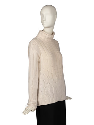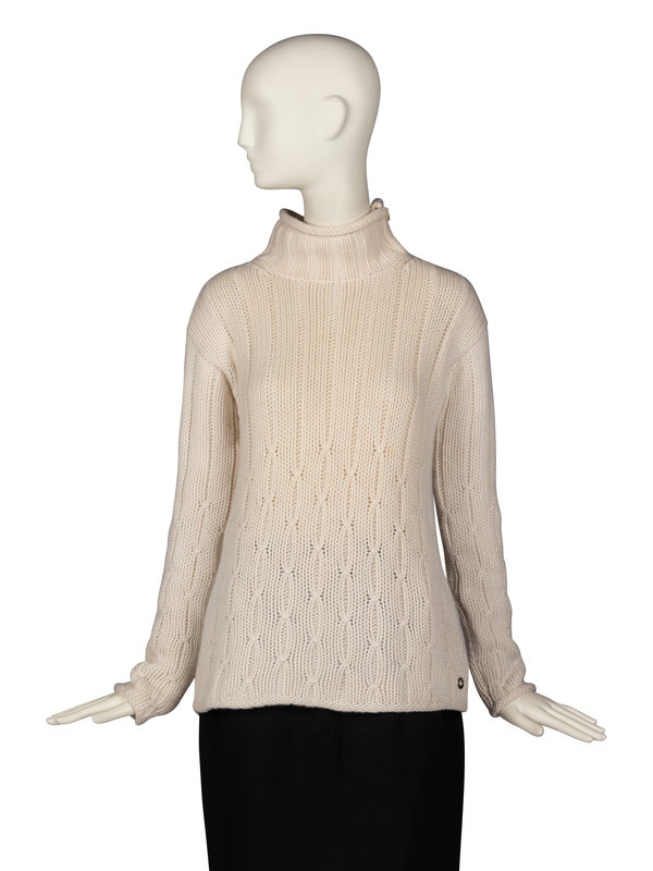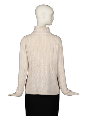 Rib-knit turtleneck in cream baby cashmere. Single button closure at neck.