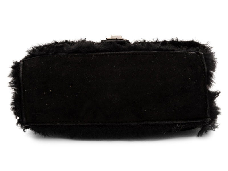 Small flap bag in black shearling with crossbody strap.