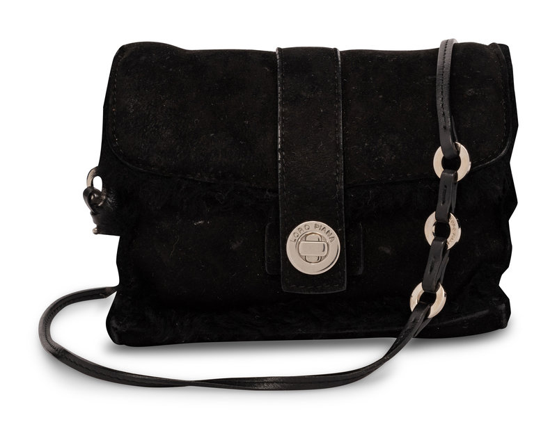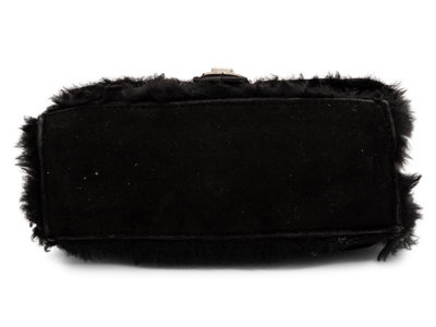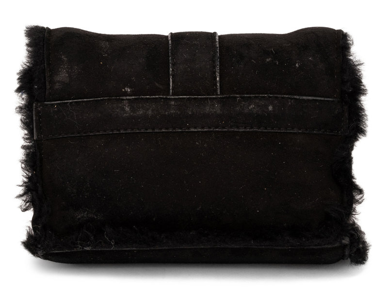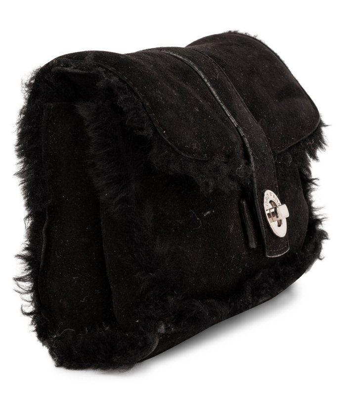 Additional Information: Suede exterior, fur interior, interior zip pouch, turn-lock closure, silver-tone metal hardware.