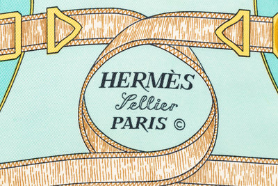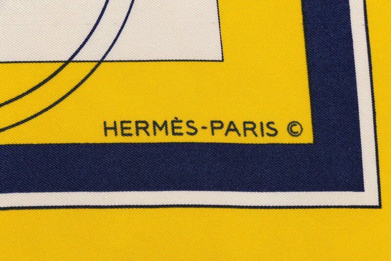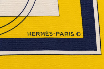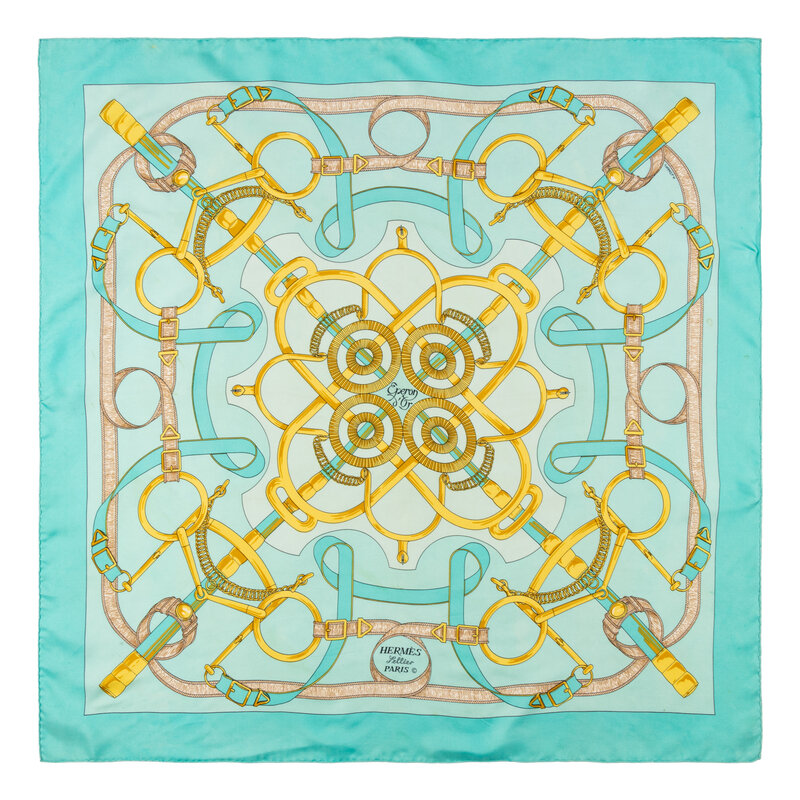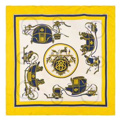 "Eperon d'Or" Scarf 90 in Printed Silk Twill with Rolled and Hand-Stitched Edges.