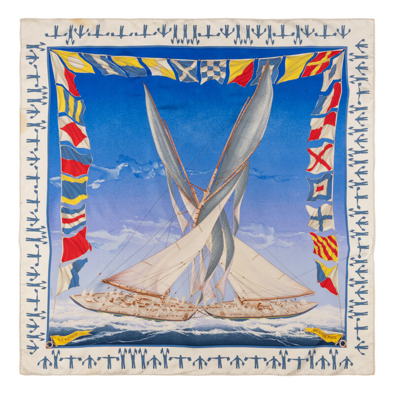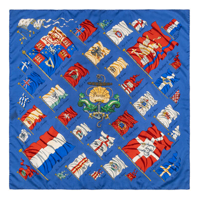 "Pavois" Scarf 90 in Printed Silk Twill with Rolled and Hand-Stitched Edges.