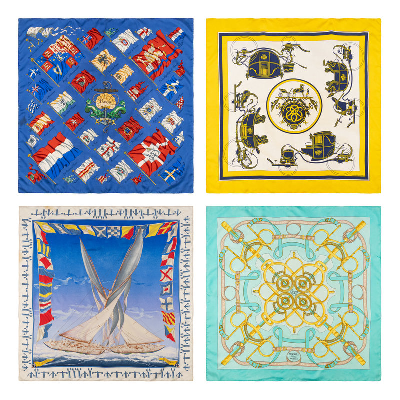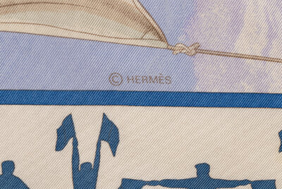 "En Course" Scarf 90 in Printed Silk Twill with Rolled and Hand-Stitched Edges.