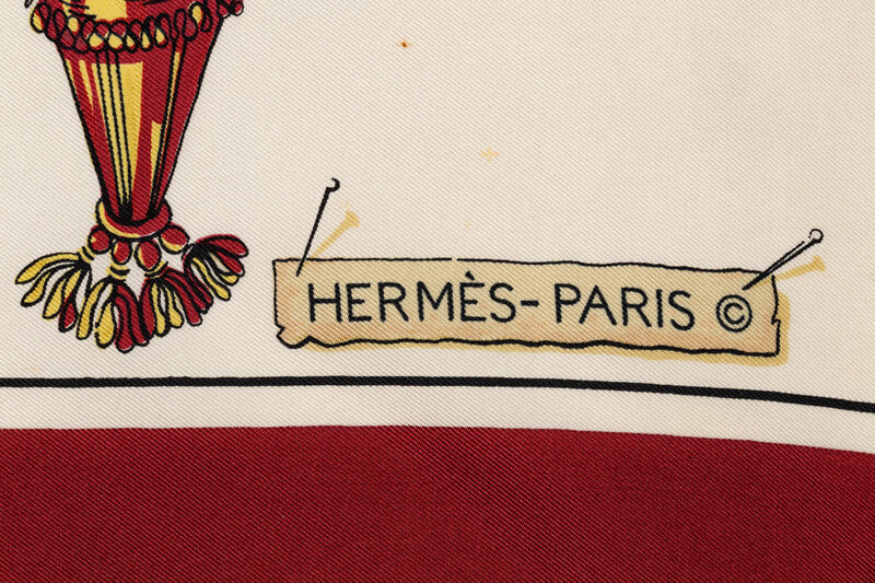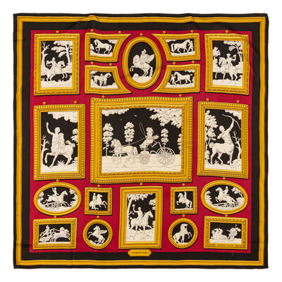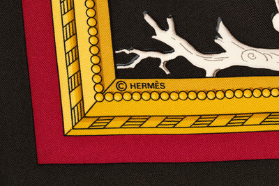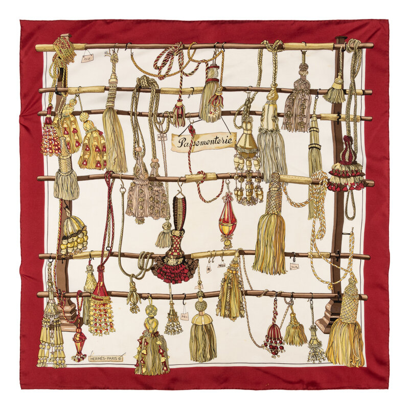 "Passementerie" Scarf 90 in Printed Silk Twill with Rolled and Hand-Stitched Edges.