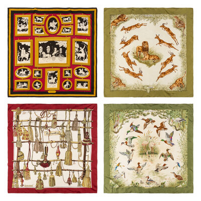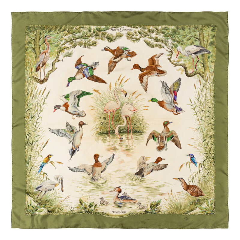 "Halte en Camargue" Scarf 90 in Printed Silk Twill with Rolled and Hand-Stitched Edges.