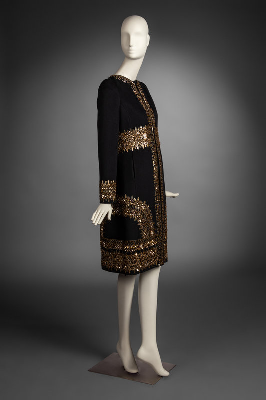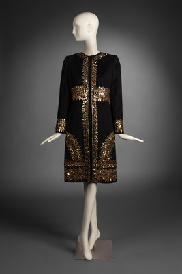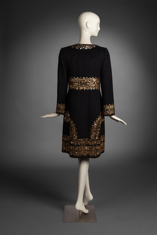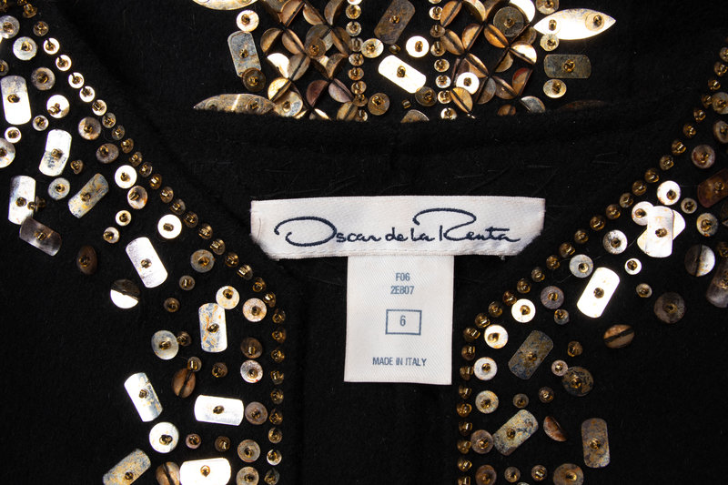 Rex rabbit fur-cashmere blend jacket in black with gold embroidered embellishments and shoulder pads. Hook-and-eye closures, slash pockets.