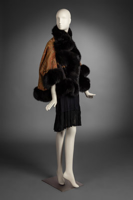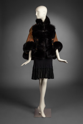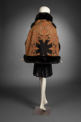 Oversized, open-front jacket in multicolor wool-cotton blend jacquard with black fox fur trim at borders and cuffs with black velvet lining.