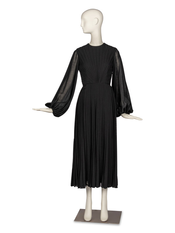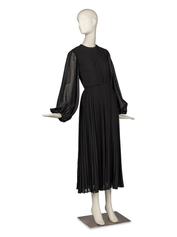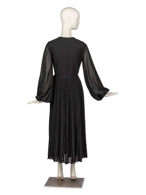 Long sleeve gown in black, pleated, semi-sheer wool voile. Dress features wide sleeves with elasticated cuffs, full pleated skirt, and full-lining.