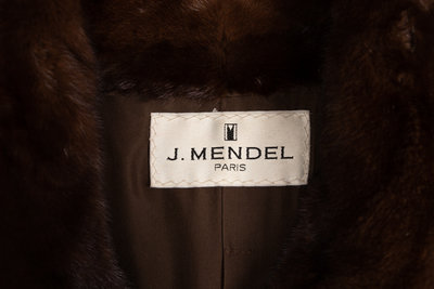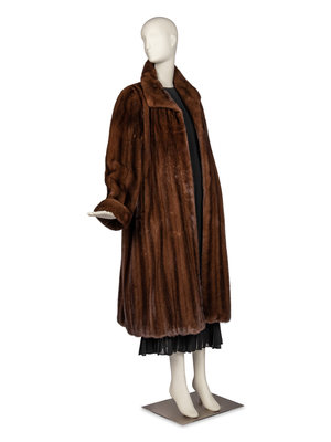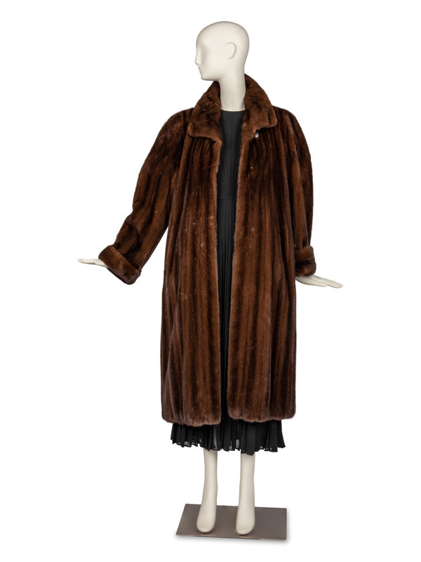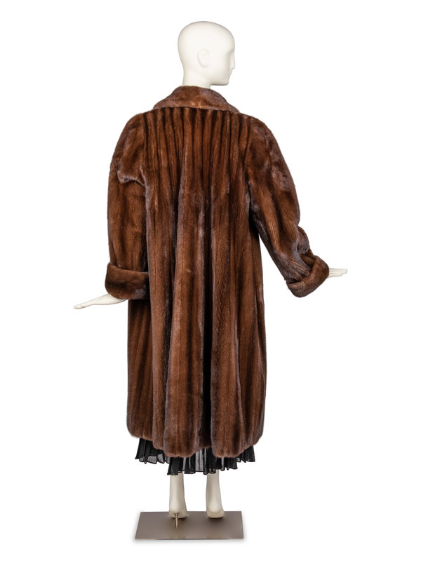 3/4 Length Mahogany Brown Mink Fur Coat with Shirt Collar. Jacket Features Single-Button Closure, Slash Pockets at Hips, and Full-Lining.