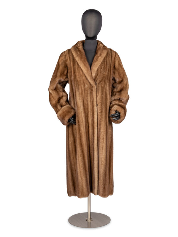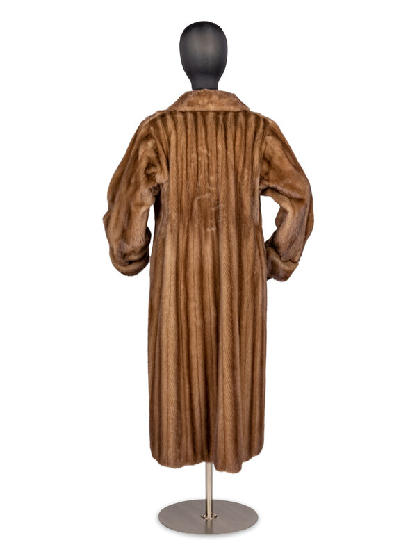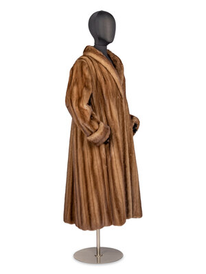 A-Line, Stroller-Length Coat in Pastel Brown Mink Fur with Shawl Collar and Rolled-Back Cuffs. Features Hook/Eye Closures, Slash Pockets at Hips, and Full-Lining.