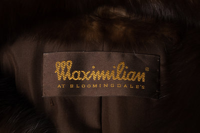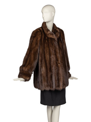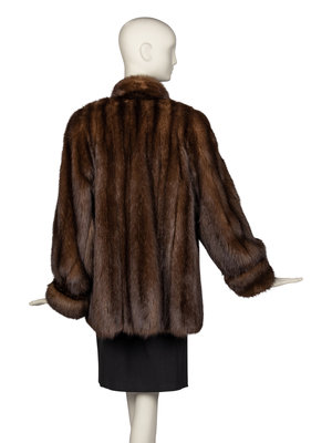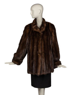 Stroller-length sable fur jacket with stand collar and cuffed sleeves. Jacket features satin lining and hook-bar closures at center front.