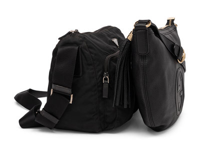 Medium shoulder bag in black nylon gabardine with with black leather trim.