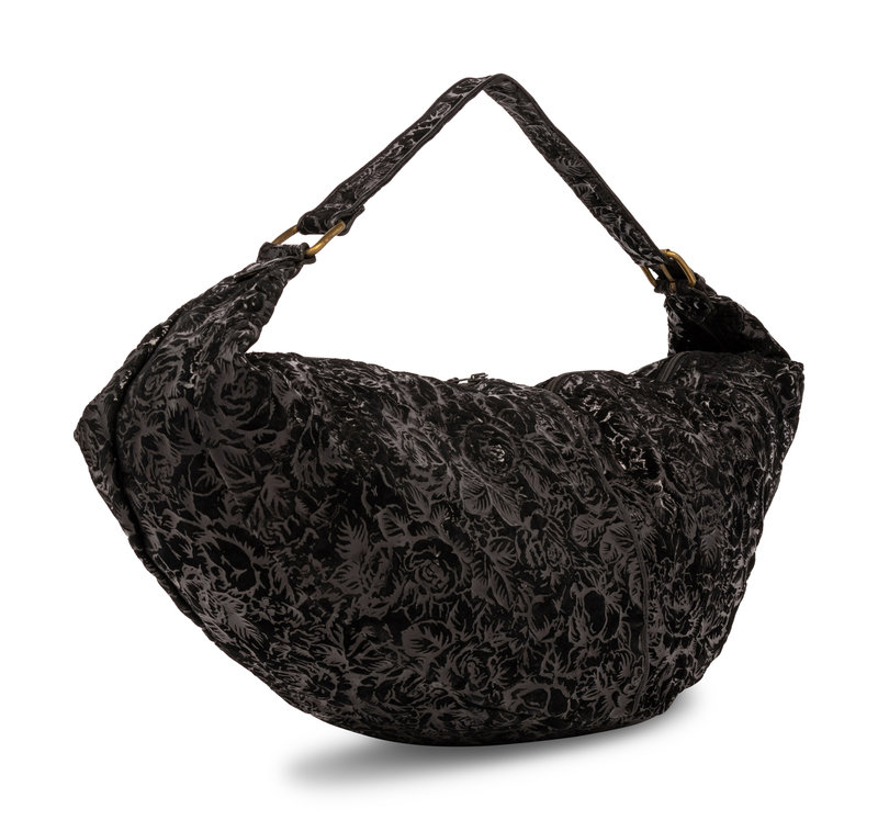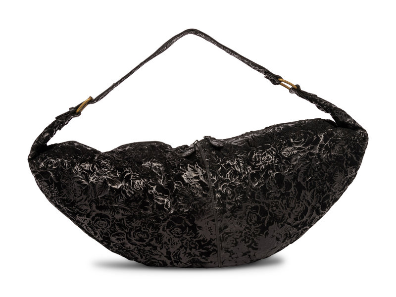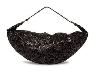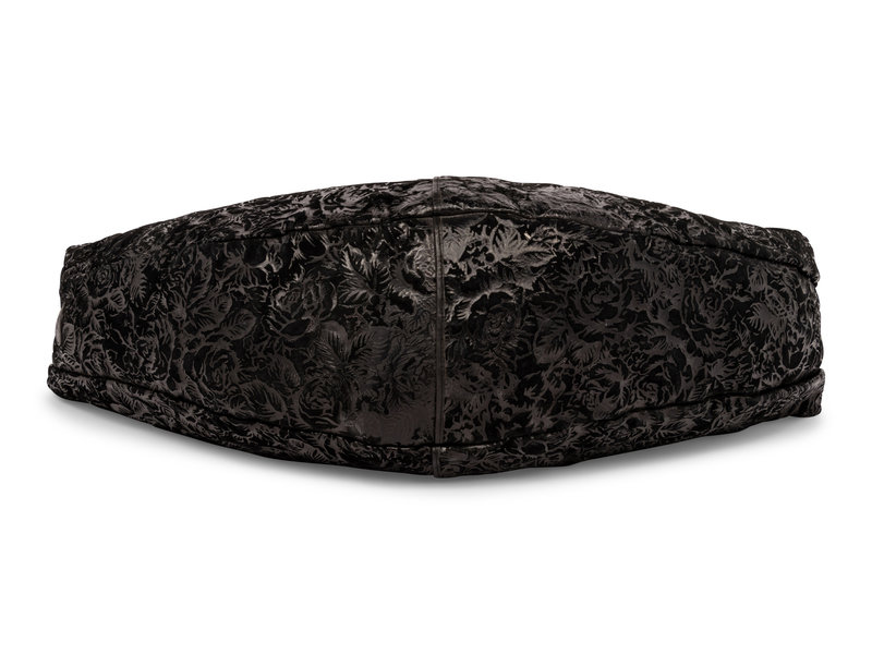 Large Hobo Bag in Black Suede with Floral-Embossment and Brass Hardware.