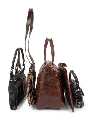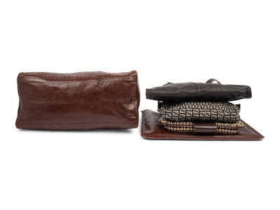 Brown embossed leather portfolio with top zipper and embossed leather pull. Double F logo lining in the interior of the bag.