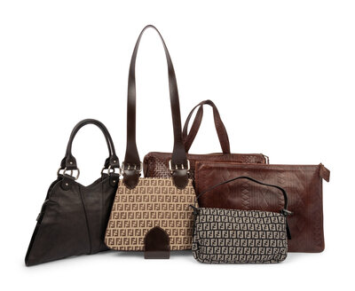 Brown woven leather bag with gold-tone double F logo at the center front of the bag, dual top handles and zippered closure with leather zipper pull.