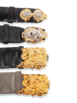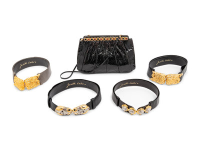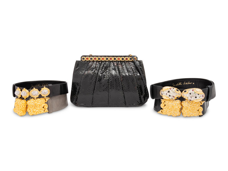 Judith Leiber Snakeskin Clutch and Four Snakeskin Belts, 1980-90s