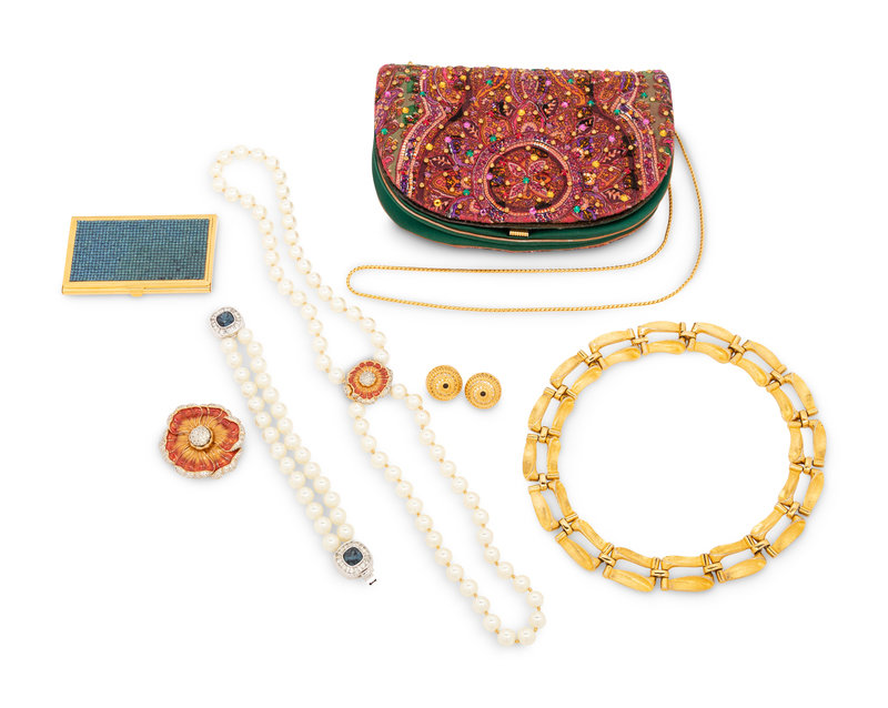 Judith Leiber Items: One Bag, One Bracelet, Two Necklaces, One Brooch, Earrings, and One Metal Card Case, 1980-90s