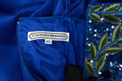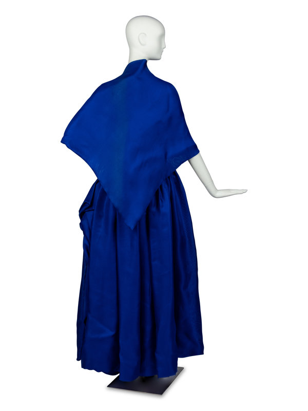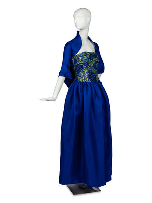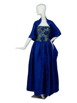 Sleeveless gown in blue silk gazar with sequin, ribbon, and rope -embellished bodice. Gown features a structured bodice with elasticated straps inside and rear zipper closure. Includes a matching shawl.