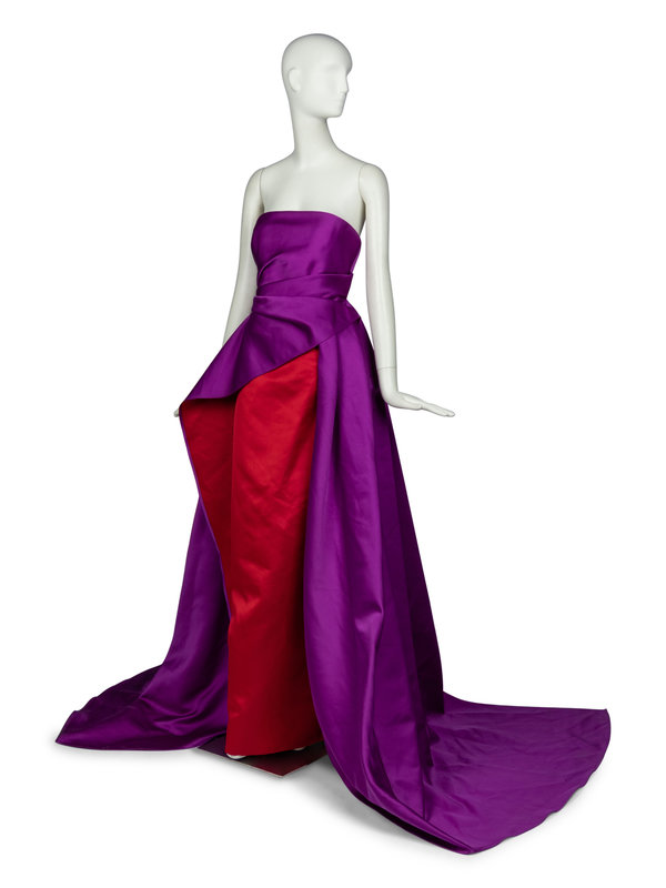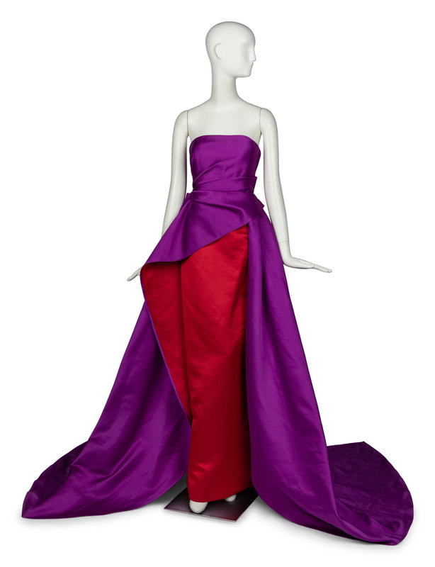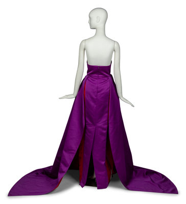 Strapless column gown with overskirt in double-face bicolor silk satin. Dress features structured mesh bodice and a rear zipper/hook closure at center back.