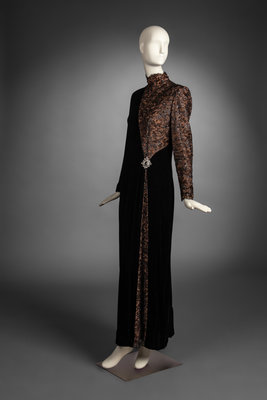 Floor-length long-sleeve black velvet gown with crystal accents, beaded metallic lace inserts, and shoulder pads. Zip closures at back and sleeves.