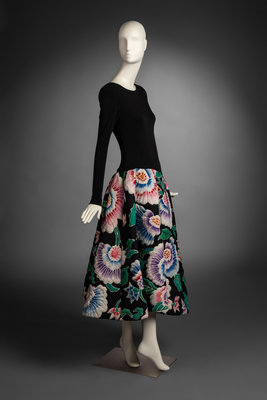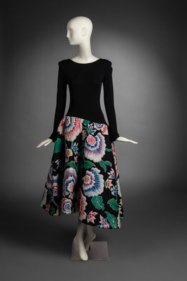 Long-sleeve A-line dress with black bodice and quilted skirt with floral motif. Padding at shoulders. Zip closures at back and sleeves.