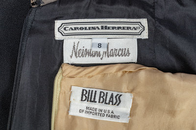 Long sleeve dress black poly crepe and semi-sheer chiffon with sequin-embellished sleeves and across chest. Rear zipper and snap closures at center back full-lining and padded shoulders.