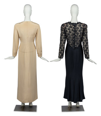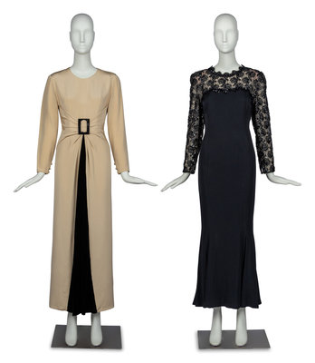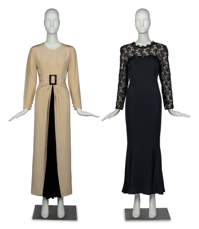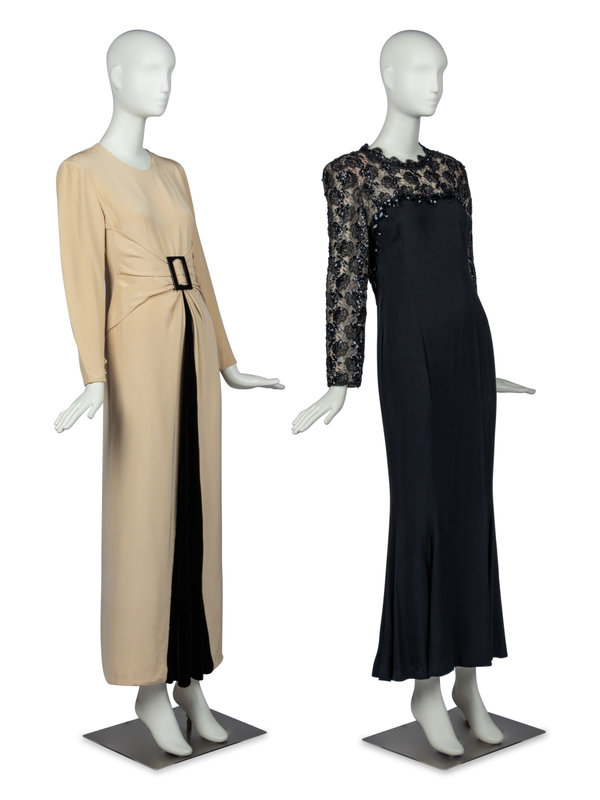 Long sleeve gown in beige poly crepe and black velvet. Dress features gathering at waistline with a decorative, false buckle, zipper closure at center back and functional buttons at cuffs.