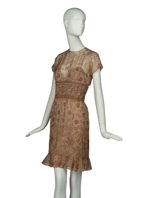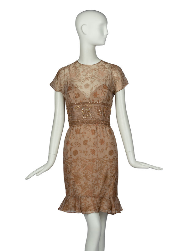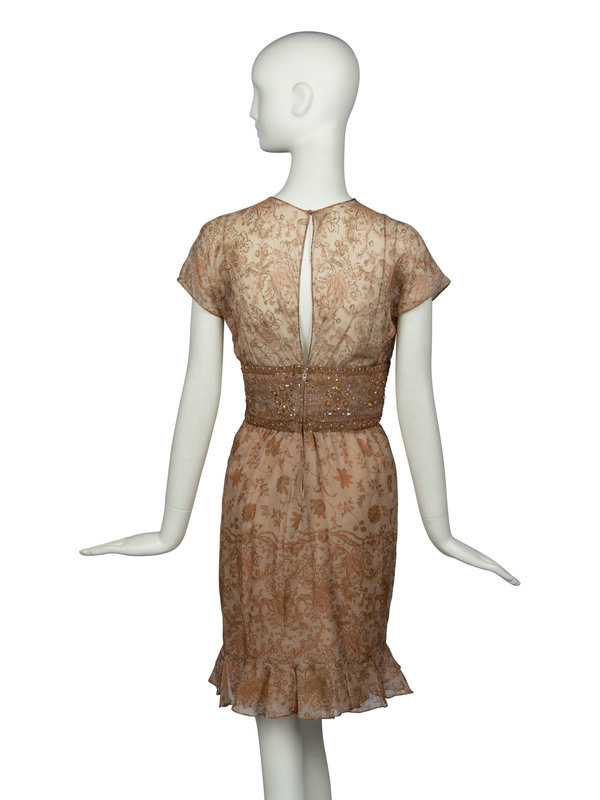Capsleeve dress in printed, lightweight silk chiffon with embellished waistline, ruffled bottom hemline, and a partially-open back. Single-button and zipper closure at center back. Fully-lined in tonal silk.