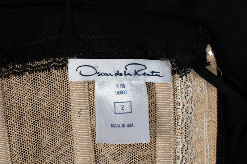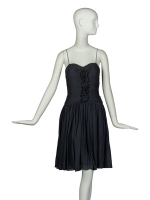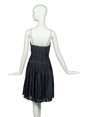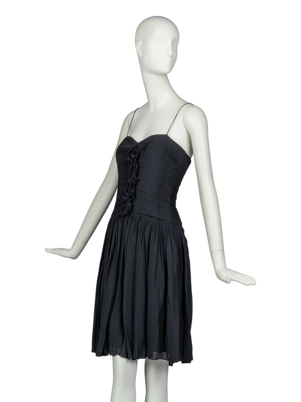 Sleeveless cocktail dress in pleated black silk chiffon with ruffle accent at center front. Spaghetti straps at shoulders and zipper closure at center back. Fully-lined with structured bodice.