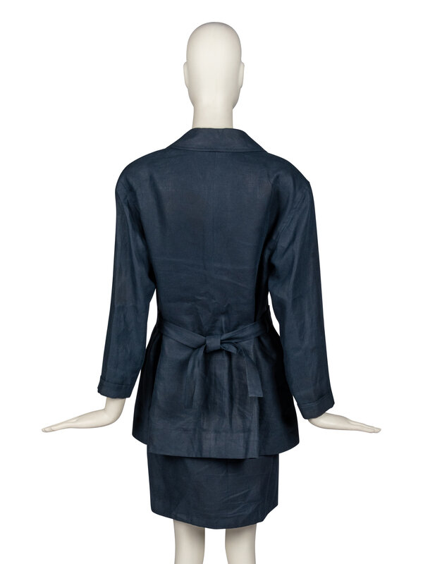 Single-breasted jacket with single chain button in dark blue linen. Jacket features silk jacquard lining, slash pockets at hips, two chest pockets, a notched collar, and a rear-belted closure.