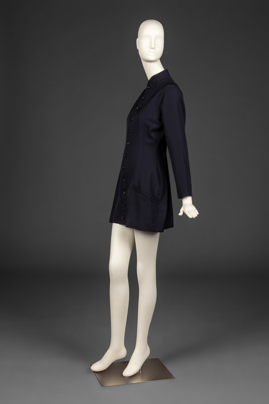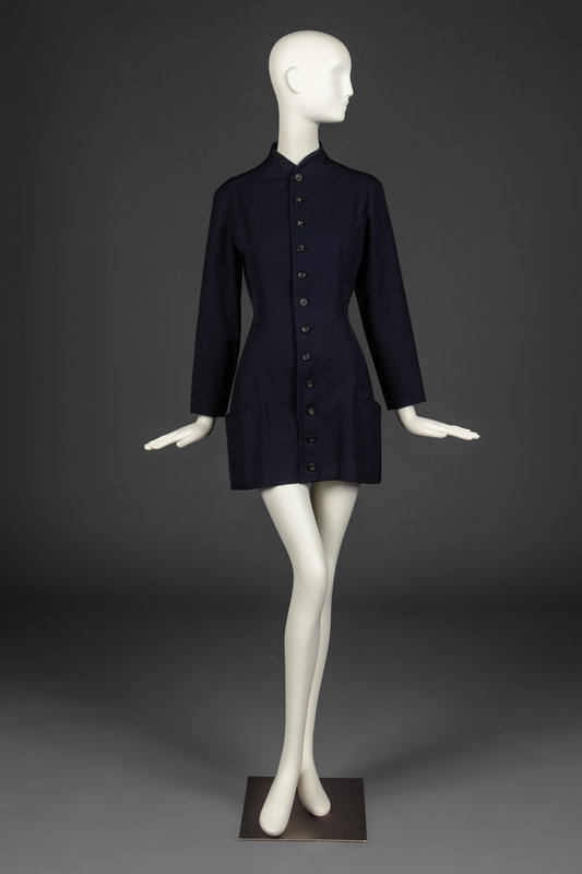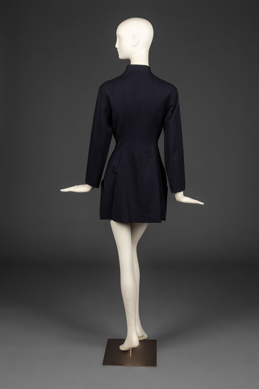 Long sleeve, single-breasted jacket-dress in dark blue wool gabardine. Dress features a small, curved collar, patch pockets at hips, and full-lining. Dress buttons all the way down the center front.