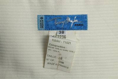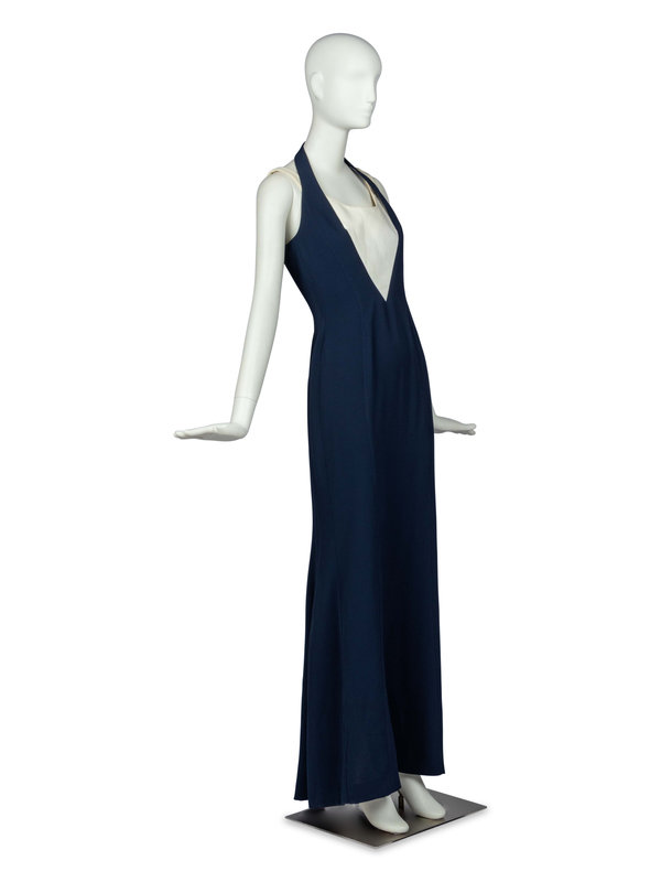 Sleeveless dress in dark blue poly knit with ribbed white cotton knit underlay. Dress features side seam zipper closure and partial lining.