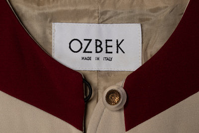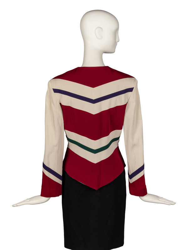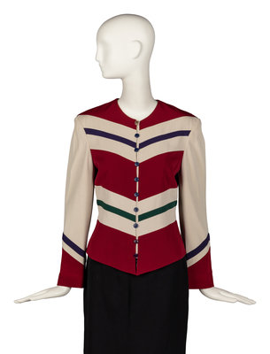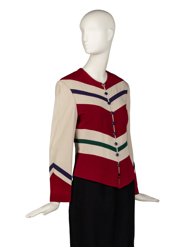 Collarless, button-front jacket in multicolor poly crepe with horizontal overlays. Button and loop closures at center front with full-lining.