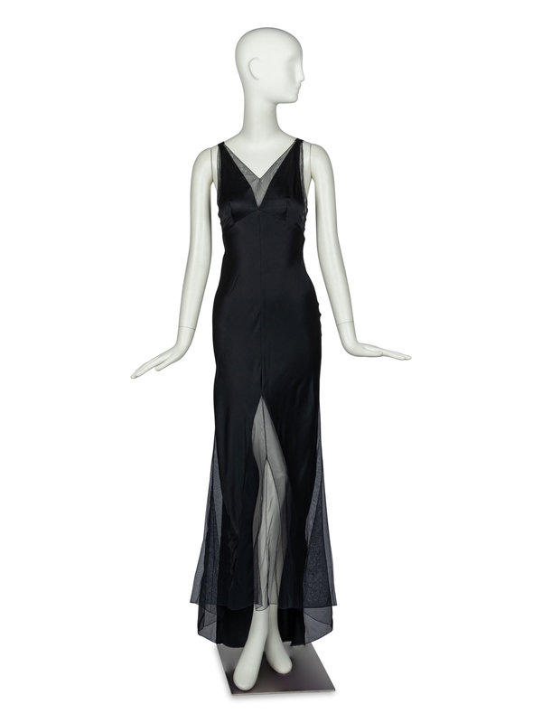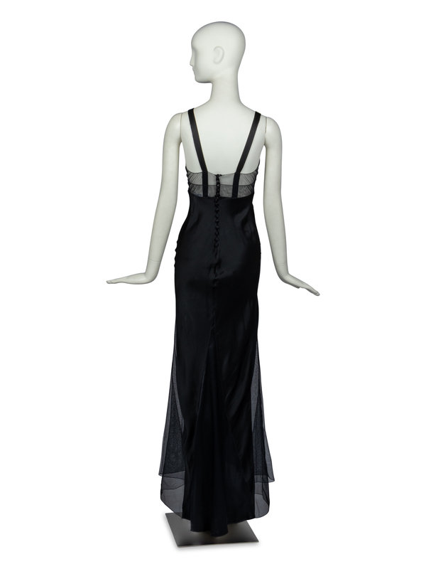 Sleeveless gown in black satin with mesh panel insertions. Dress features fabric-covered buttons at rear center back closure.
