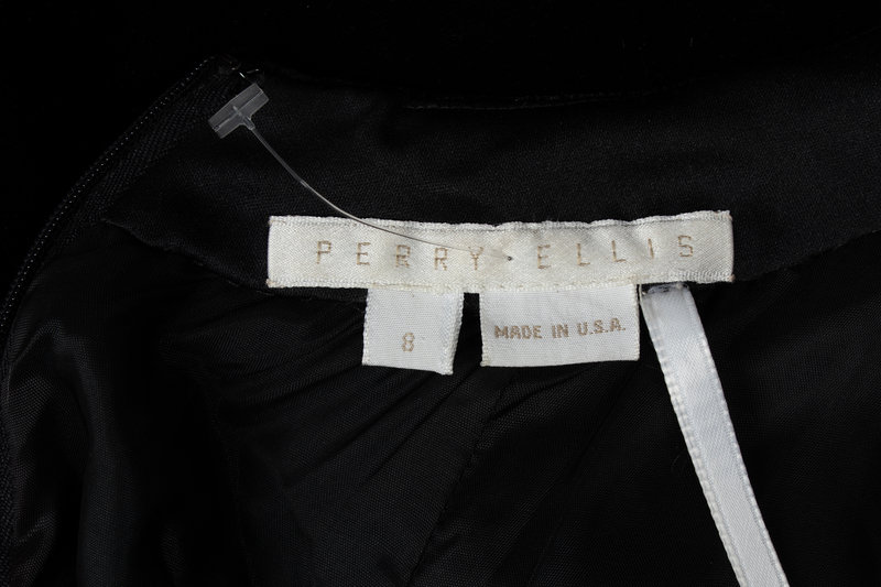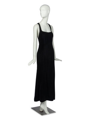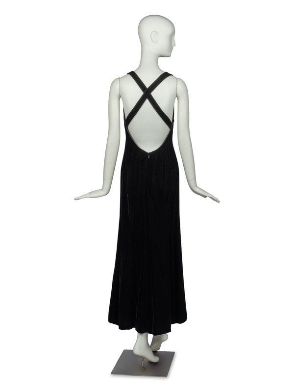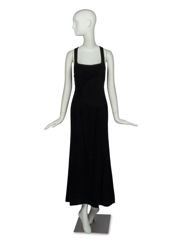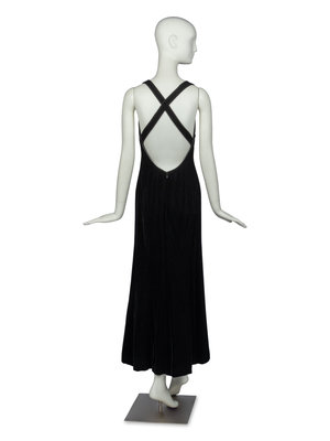 Strapless floor-length dress in black velvet. Crossover shoulder straps attached with button, hook-and-bar, and snap closures at bust. Zip closure at back. Darts along front. Fully lined.