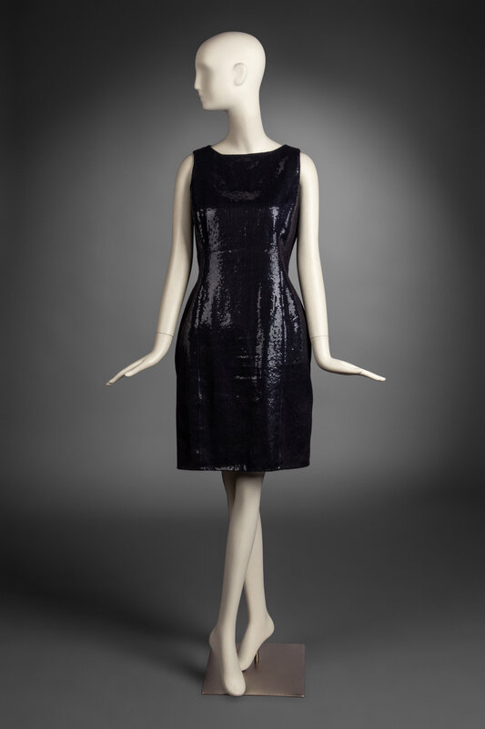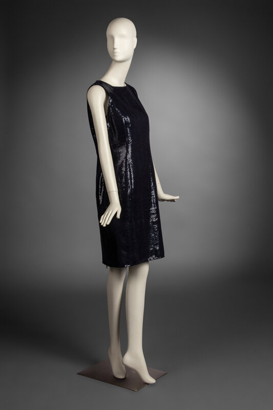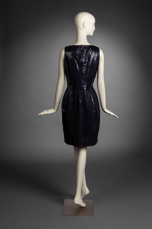 Knee-length navy blue sequin sheath dress. Zip closure at back.