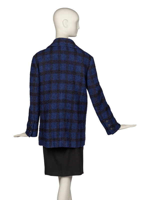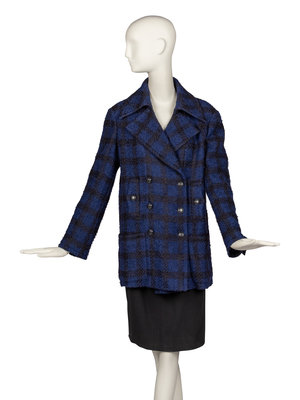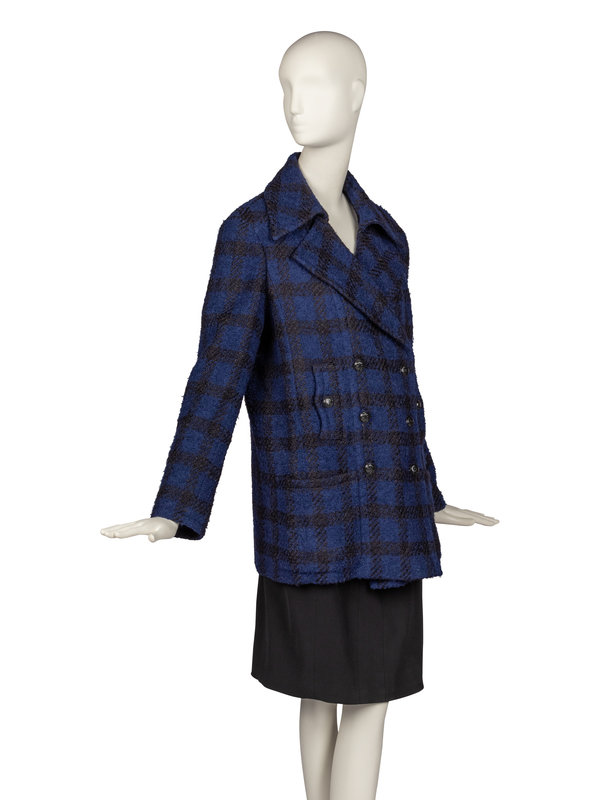 Double-breasted, button-front pea coat in black-blue wool blend boucle plaid with notched collar. Jacket features black CC motif button, silk jacquard lining, four pockets at front, and functional buttons at cuffs.
