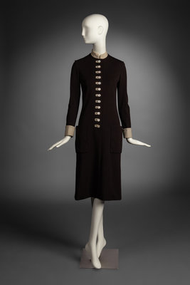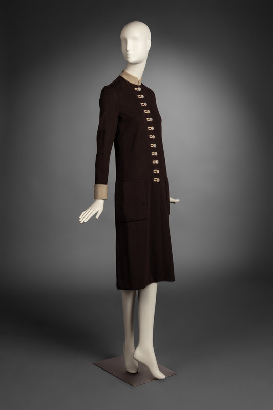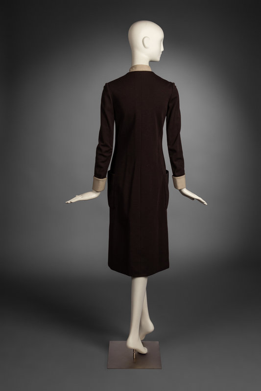 Knee-length shift dress in dark brown wool with contrasting cuffs and stand collar. Mother-of-pearl button closures at front.