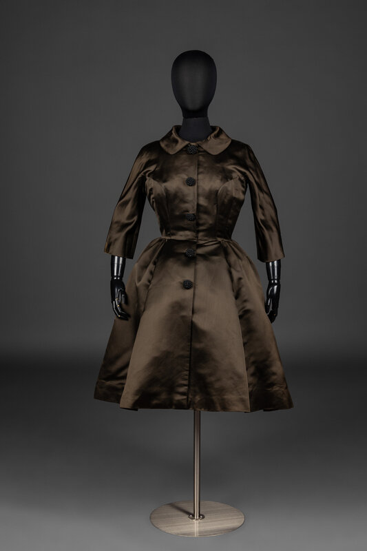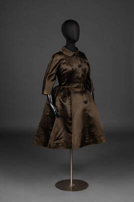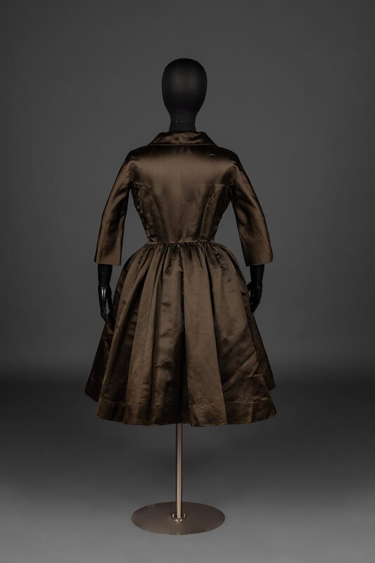 3/4 length sleeve dress with round-collar in dark olive brown silk satin with decorative snap-buttons and hook closures at center front. Dress features black silk and mesh lining with a full, pleated-skirt.