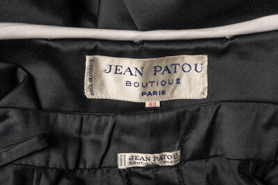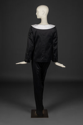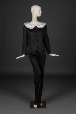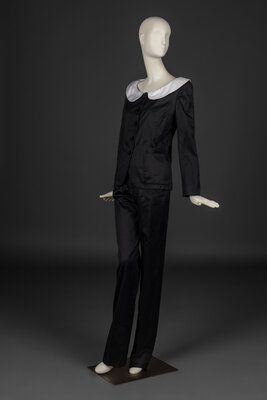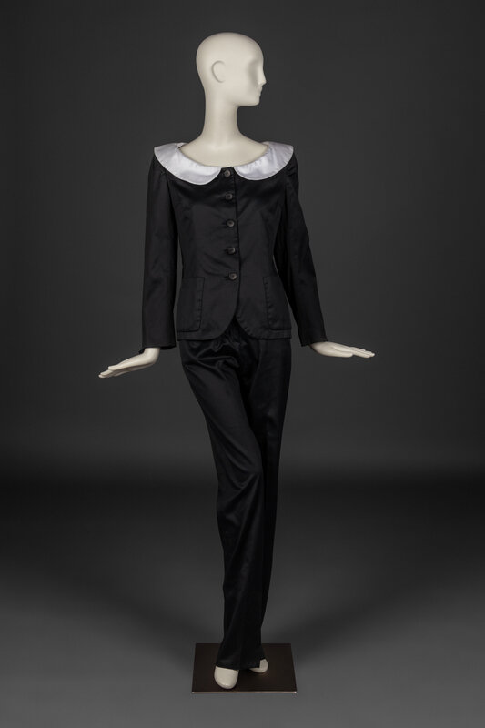 Wide-neck, button-front jacket in black cotton sateen with removable white collar. Jacket features a center front button-closure and two patch pockets at sides. Unlined.