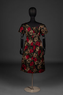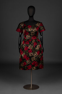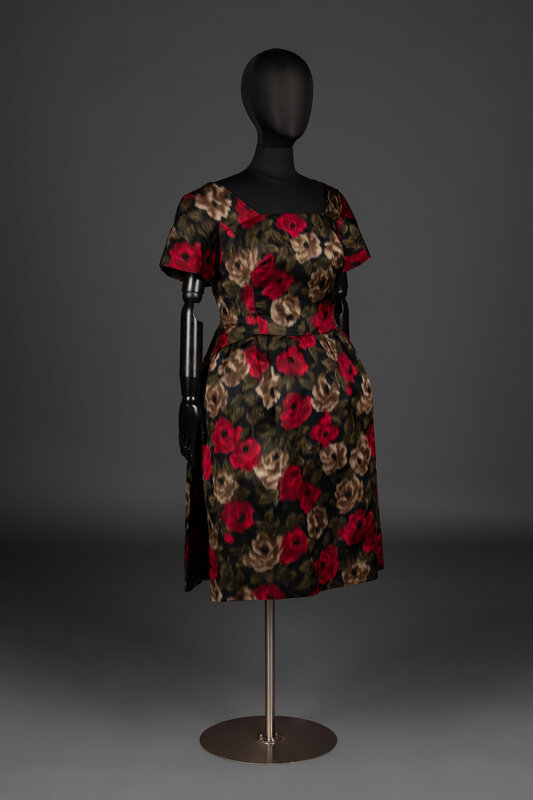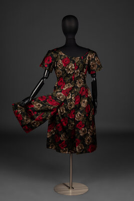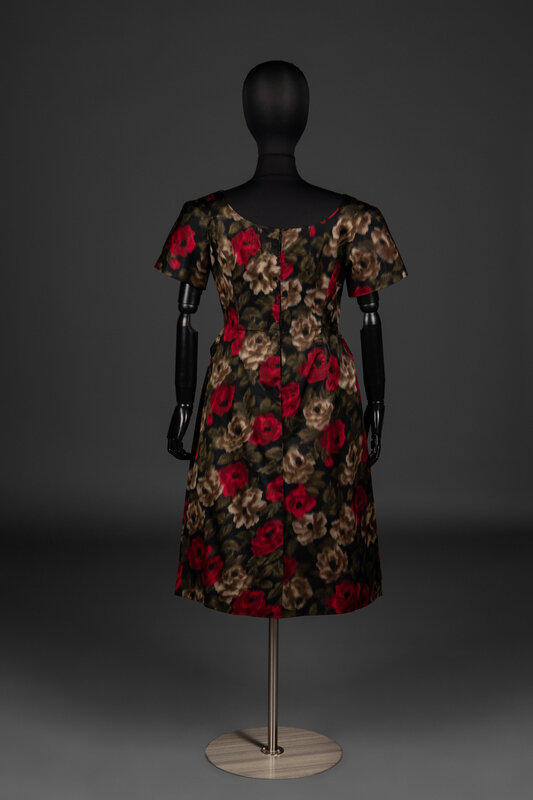 Short sleeve, boat neck dress in multicolor floral-printed silk satin. Dress features two tails extending from rear waistline, rear zipper closure, and silk lining.
